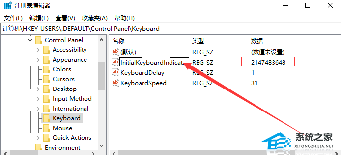 3、依次找到 DEFAULTControl PanelKeyboard ,右边有 InitialKeyboardIndicators ,右击 - 修改,将它的值改为2。