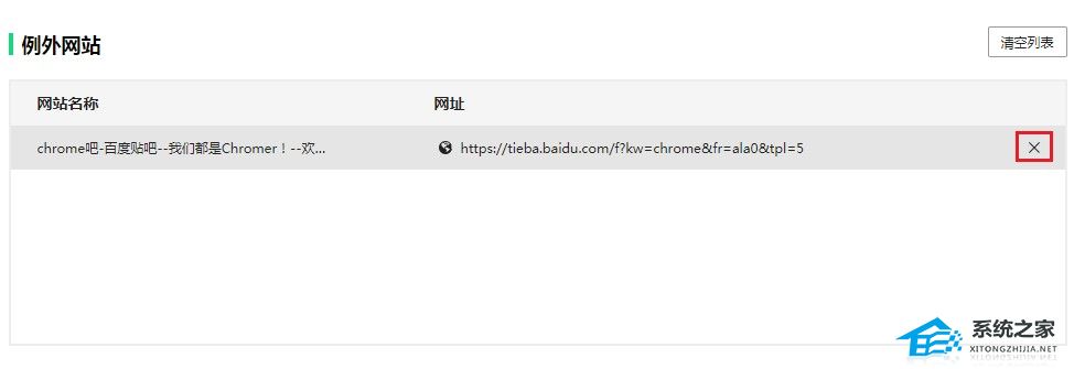 3、进入登录管家设置页面后,在页面中找到“例外网站”这一栏,在其中找到永不保存的网页,将鼠标移动上去之后点击其右侧的按钮将其删除就可以了。
