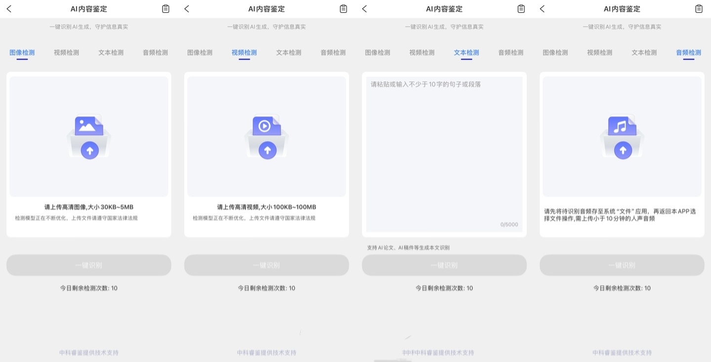系统之家实测,国家反诈中心的 AI 内容鉴定功能支持图像、视频、文本、音频的 AI 内容检测。使用时需按照对应模块上传具体的内容。其中,图片限制大小 30KB~5MB、视频限制 100KB~100MB、文本限制 10 字 ~5000 字、音频则限制小于 10 分钟的人声音频。
