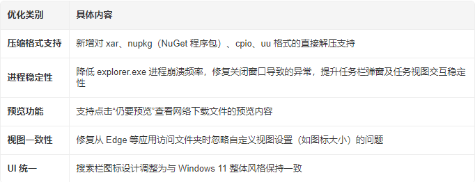 文件资源管理器响应速度显著提高,尤其在开机后首次启动时效果明显。此次优化未采用此前测试的预加载功能,而是直接对程序本身进行了性能优化,改善了低配硬件上的加载延迟问题。